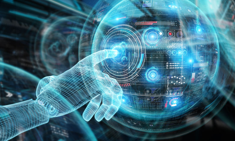 控制室中的机器人驾驶一艘白色的现代宇宙飞船在空间上有视窗和数字地球全息图3D绘制图片ID: 572461