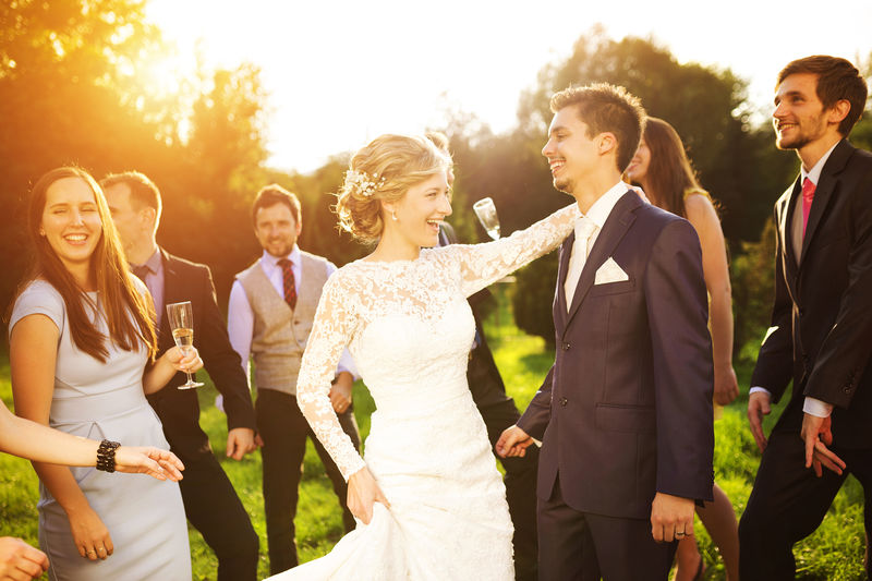 新婚夫妇和客人一起参加他们的花园聚会图片ID: 670972
